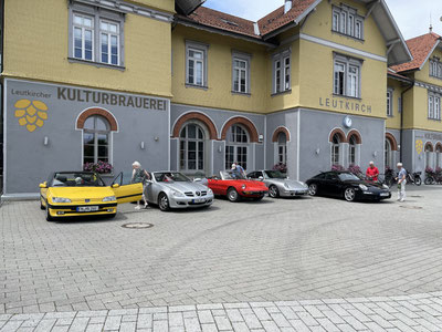 Freitag, 18.7.2025, 10:30 Uhr Treffpunkt "Blaue Lagune" in Kressbronn. 9 Personen auf 5 Autos. Heinz führt uns auf wie gewohnt schönen engen Strassen nach Leutkirch. Dort Mittagessen in der "Kulturbrennerei " im liebevoll renovierten ehemaligen Bahnhof mit eigener Brauerei. Weiterfahrt zum Schloss Zeil mit herrlicher Gartenanlage.